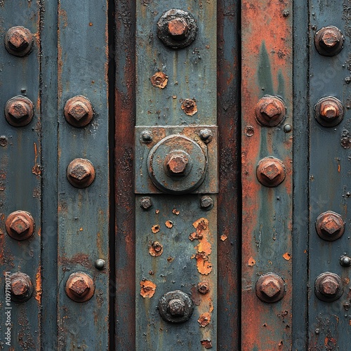 Fototapeta premium Close-up of a weathered metal door with bolts and rust.