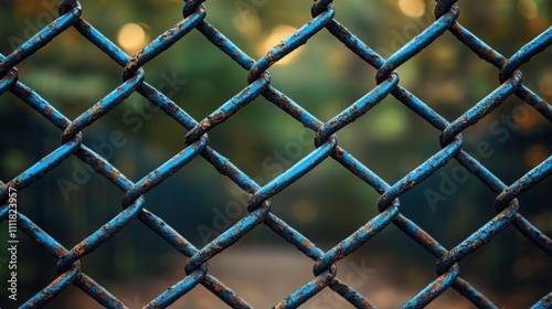© Наталя Ласько, Fototapeta premium Close-up of a weathered steel mesh fence reveals a grid pattern highlighted by rust and dirt, suggesting aging due to exposure in an urban environment.