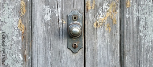 Fototapeta premium Close up of a weathered wooden door slightly ajar with a sleek silver handle inviting curiosity and exploration