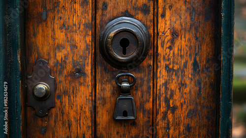 Fototapeta premium Close-up of a weathered wooden door with a keyhole, a doorknob, and a small...