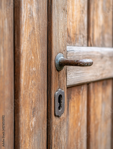 © Crealif76, Fototapeta premium Close-up of a weathered wooden door with a vintage doorknob and keyhole.