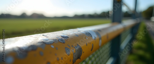 © StockPick, Fototapeta premium Close-up of a weathered yellow fence, paint peeling, revealing a blurry green field background. Sunlit, peaceful scene.