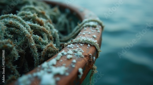 Naklejka premium Close-up of a Well-Used Fisherman's Net with Algae and Salt Crusting the Edges