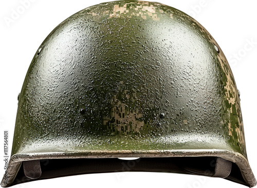 © vuang, Naklejka premium Close-up of a wet camouflage helmet