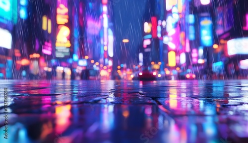 Fototapeta premium Close-up of a wet street with neon light reflections in the rain, blurred city background at night.