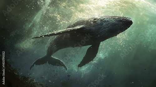 © MACHATOMI, Obraz premium Close-up of a whale leaping from the sea, water droplets frozen in mid-air, natural ocean hues and realistic whale texture