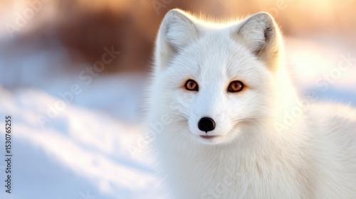 Obraz premium Close-up of a white Arctic fox in a snowy landscape during golden hour,...