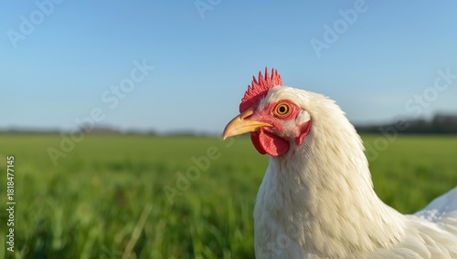 Fototapeta premium Close-up of a white Broiler Chicken on a free-range farm emphasizing animal welfare practices