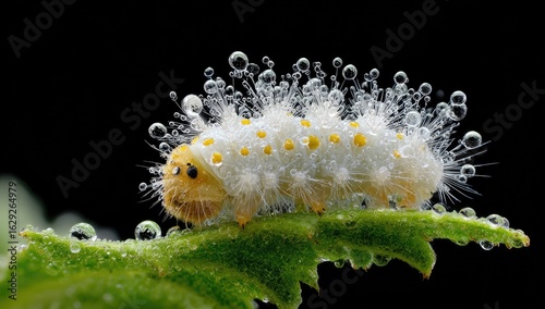 © WAFELLO, Naklejka premium Close-up of a white caterpillar, covered in dew drops, on a leaf