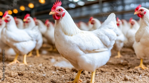 © Moopingz, Fototapeta premium Close-up of a white chicken standing confidently in a free-range farm environment surrounded by other hens on dirt ground.
