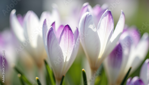 © Ksenia Pestereva, Fototapeta premium Close up of a white crocus blooming in springtime, with delicate petals and a soft pastel color