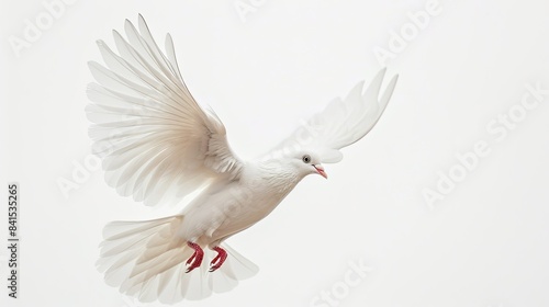 Fototapeta premium Close-up of a white dove soaring against a blank sky, elegant wings spread wide