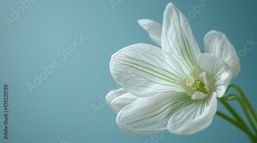Fototapeta premium Close-up of a white flower with green stamens against a blue backdrop Soft...