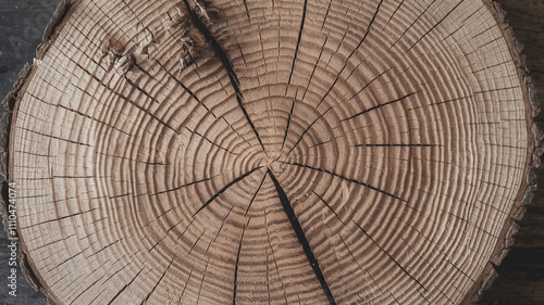 Naklejka premium Close-up of a White Oak tree cut surface showcasing detailed growth rings, natural wood texture, and intricate patterns, ideal for woodworking, design inspiration, or educational purposes.