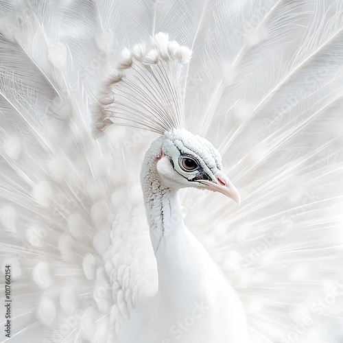 Fototapeta premium Close-up of a White Peacock's Feathers with Its Head and Eye Visible.