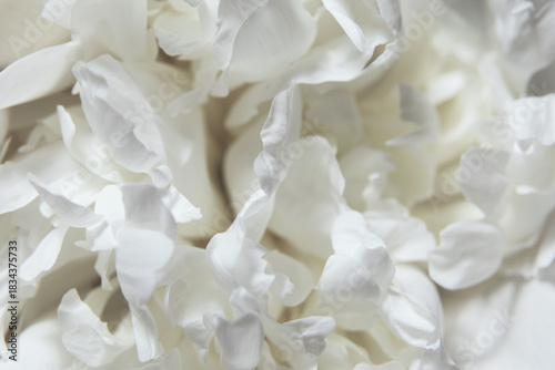Obraz premium Close-Up of a White Peony flowers blooming. Detail macro shot of delicate texture of white peony petals and gentle tone of cloud dancer pantone color of year 2026 stylish flat lay. Soft focus