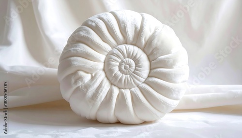 © Hasan, Obraz premium Close-up of a white, spiral-shaped object resembling a nautilus shell, resting on draped white fabric