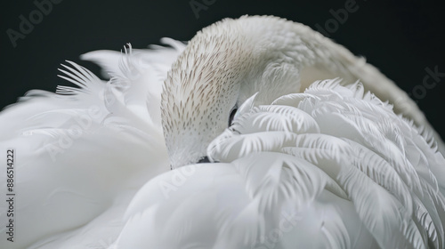 © Santy Hong, Obraz premium Close-up of a white swan's profile with intricate feather patterns visible