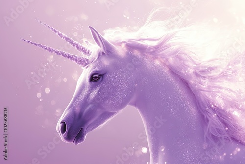 Fototapeta premium Close-up of a White Unicorn with Glittering Horn and Mane Against a Purple Background
