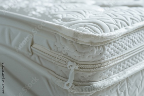 © Evarelle, Naklejka premium Close-Up of a White Zippered Mattress with Intricate Patterns and Textures