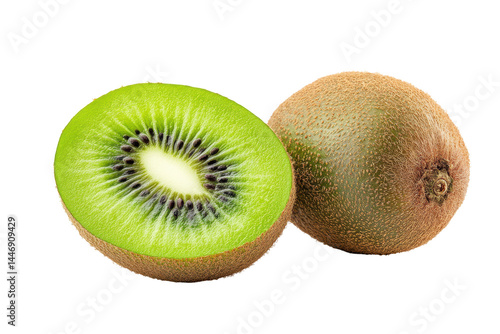 © Agri, Obraz premium Close-up of a whole and a halved kiwi fruit, showcasing the vibrant green and brown colors. The image presents a healthy, fresh, and tasty food item.