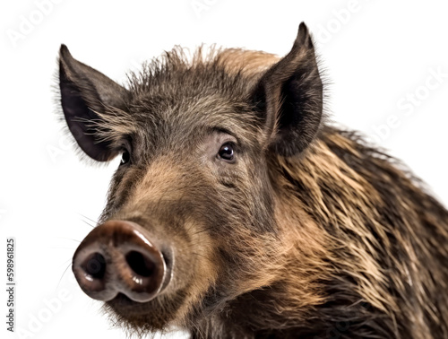 Fototapeta premium Close-up of a wild boar in front of a white background. Generative AI.