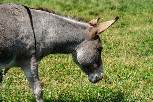 © henjon, Fototapeta premium Close up of a wild Donkey grazing on a field.