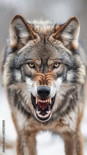 Fototapeta premium Close up of a wild gray wolf snarling with sharp teeth and yellow eyes,...