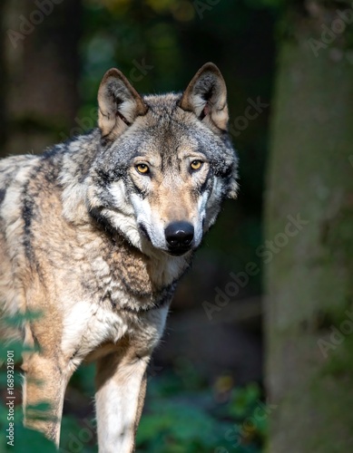 © Kaulo, Fototapeta premium Close-up of a wolf in a forest