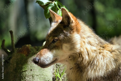 Obraz premium Close-up of a wolf in a forest with sunlight highlighting its fur