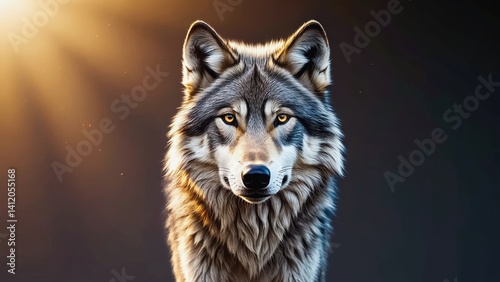 © Oleg, Obraz premium Close-up of a wolf's head with intense gaze, set against dramatic background with sunlight effect.