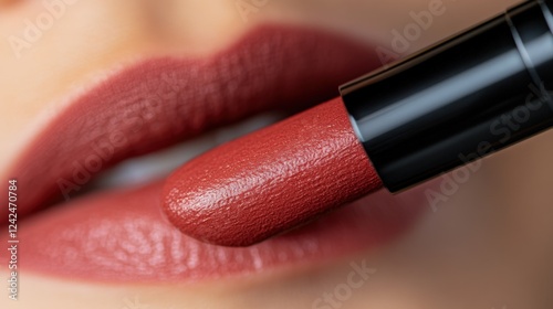 Obraz premium Close-up of a Woman Applying Red-Brown Lipstick