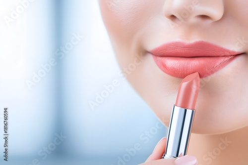 © Наталья Лазарева, Obraz premium Close-up of a woman applying soft pink lipstick to her lips, showcasing beauty and makeup artistry with a blurred background enhancing the focus on her lips and the cosmetic product