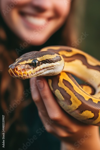 Fototapeta premium Close-up of a woman holding a colorful ball python snake, showcasing pet...