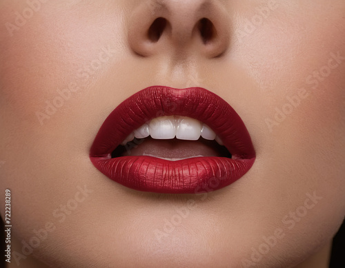 © burntime555, Fototapeta premium Close-up of a woman red lips, slightly parted, showcasing lipstick application.