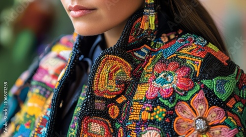 © Fomo Creative, Obraz premium Close-up of a woman's beaded jacket with colorful floral patterns.