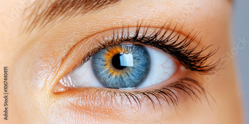 Obraz premium Close-up of a woman's blue eye with long eyelashes.