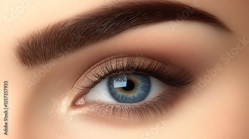 © hooh, Obraz premium Close-up of a woman's blue eye with perfectly shaped eyebrows and makeup.