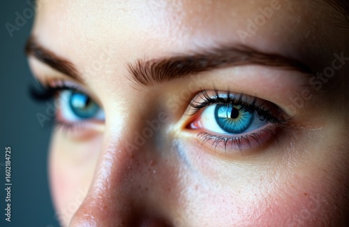 © starush, Fototapeta premium Close-up of a woman's blue eyes with detailed skin texture and natural eyebrows
