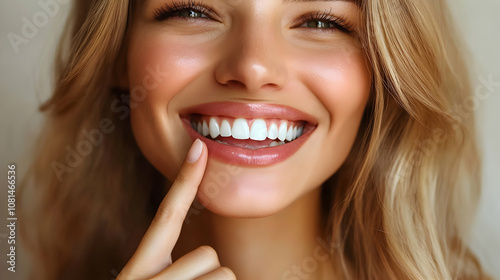 © Neural9 Project, Obraz premium Close-up of a Woman's Bright, White Smile with Healthy Gums and Long Blonde Hair, Showing Radiant Beauty and Confidence.