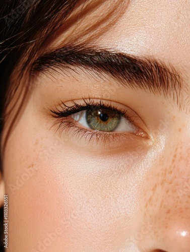 © nattapon, Obraz premium Close-up of a woman's eye showcasing vibrant green hues and freckles, capturing natural beauty and detail, Ideal for beauty, skincare, or eye health projects, advertisements, and editorial content,
