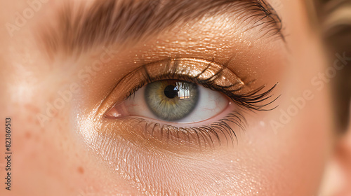 Obraz premium Close-up of a woman's eye with gold eyeshadow and perfectly groomed...