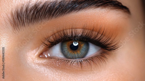 Fototapeta premium Close-up of a woman's eye with long, dark eyelashes and peachy eyeshadow.