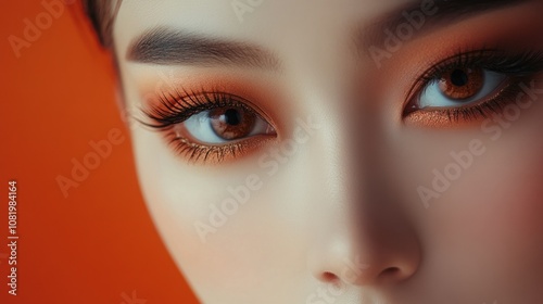 © Rere_Art151, Fototapeta premium Close-up of a Woman's Eye with Orange Eye Shadow and Long Eyelashes