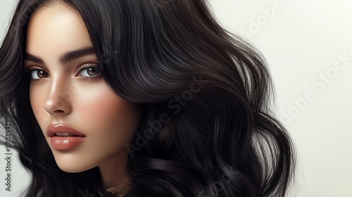 © RaptorWoman, Obraz premium Close-up of a woman's face, showcasing smooth skin, glossy lips, and flowing dark hair, exuding elegance and beauty.