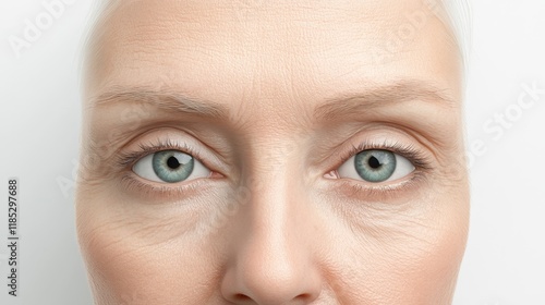 © อาริษา วันดี, Fototapeta premium Close-Up of a Woman's Face with Clear Blue Eyes Reflecting Emotion and Depth, Showcasing Natural Skin Texture and Subtle Aging Features in a Minimalist Style
