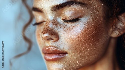 Fototapeta premium Close-up of a woman's face with freckles and glitter.