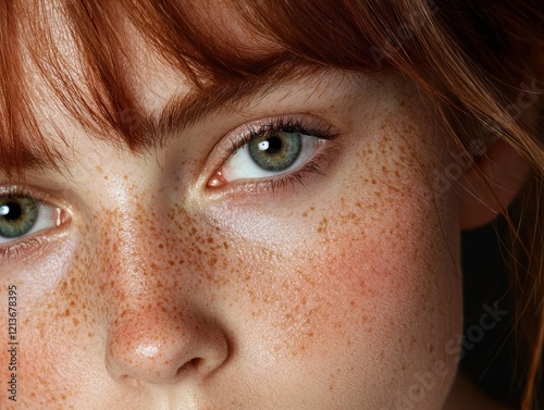 © Balaraw, Fototapeta premium Close-up of a woman's face with freckles and green eyes