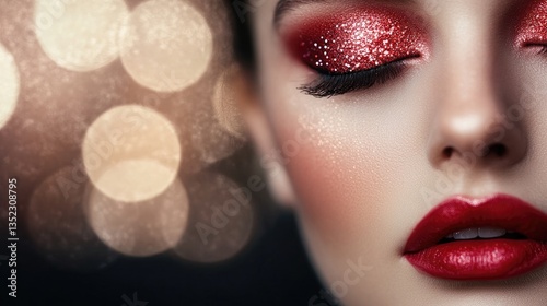 © Af, Fototapeta premium Close-up of a Woman's Face with Sparkling Red Glitter Makeup