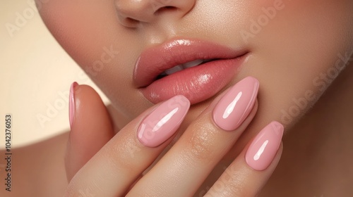© Aziz, Obraz premium Close-up of a woman's hand with pink glossy nails.
